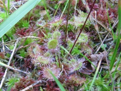 | Am Biotop angekommen, präsentierten die Aquarianer den Kindern zunächst den Sonnentau, eine seltene unter Naturschutz stehende fleischfressende Pflanze, die im Biotop wächst. Mit den Keschern ging es dann zu den Tümpeln, um die Natur zu erkunden. Die gefangenen Tiere wurden von den Kindern in einem Aquarium gesammelt und anschließend gemeinsam betrachtet. Darunter fanden sich Frösche, Molche, Libellenlarven und Wasserläufer. | ||